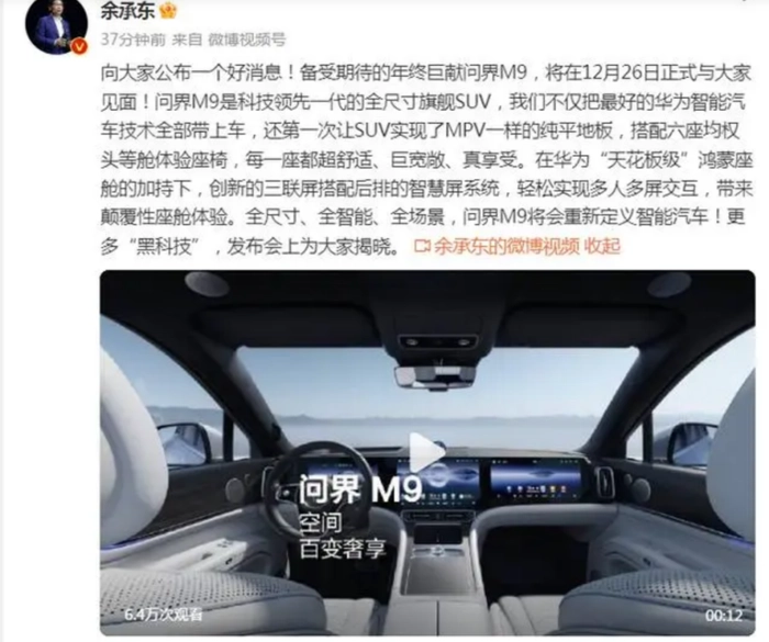 问界M9以高端市场为主要目标。华为常务董事、终端BG CEO、汽车智能解决方案BU董事长余承东曾称其“将重新定义1000万元内最好的智能SUV。”该款售价高达46.98万元至56.98万元,但上市后市场反应强烈,上市62天订单突破50000台。