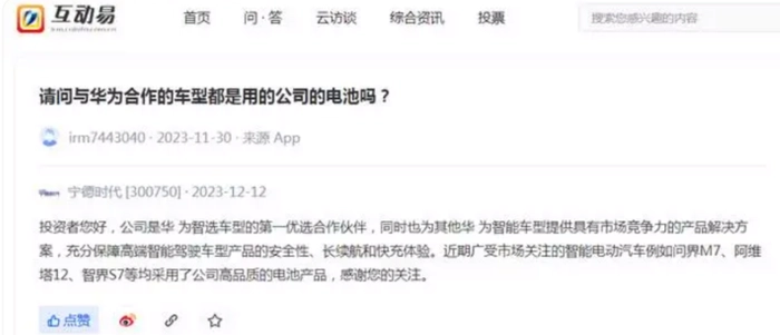 从宁德时代专门派出工程师团队驻厂服务,就可以看出对华为的偏爱。宁德时代甚至还专门对投资者提问的“与华为合作的车型都是使用的宁德时代电池吗?”进行了回复,回复中称“宁德时代是华为智选车型第一优选合作伙伴,问界M7、阿维塔12、智界S7等车型均采用宁德时代的电池。”