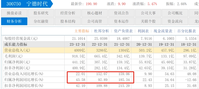 宁德时代虽然还是全球市场占有率第一,但在国内已经明显感觉到比亚迪等竞争对手的追赶,加上一些车企开始自研电池,其营收增幅已经从高位滑落,2023年财报显示,2023年宁德时代营收4009亿元,同比增长22.01%;归母净利润为441.2亿元,同比增长43.58%。而在2022年营收和净利润的增幅分别为152.07%和92.89%,增长幅度下滑较为明显。