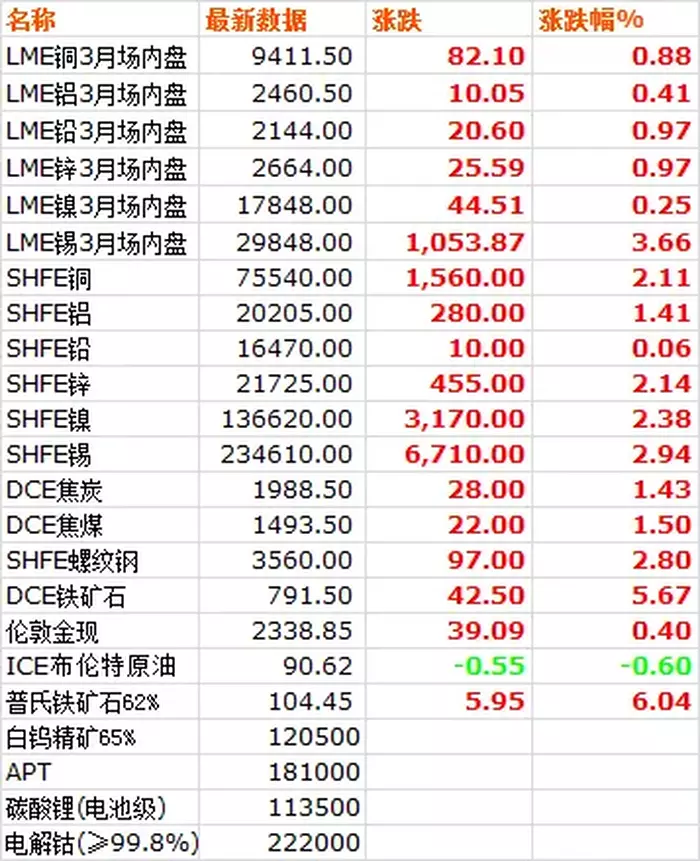 4月8日,LME六种基本金属价格全线上涨,锡领涨大盘。三月期铜价先抑后扬,收于9411.5美元/吨,上涨0.88%。三月期铝价探底回升,收于2460.5美元/吨,上涨0.41%。三月期铅价收于2144美元/吨,上涨0.97%。三月期锌价收于2664美元/吨,上涨0.97%。三月期锡价收于29848美元/吨,上涨3.66%。三月期镍价收于17848美元/吨,上涨0.25%。