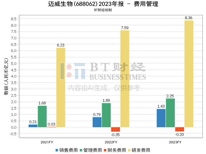 2023年,迈威生物实现营业收入12,783.55万元,同比增长361.03%,主要来源于技术服务收入和药品销售收入。营业成本为136.98万元,毛利率为98.93%,较上年同期略有下降。净利润方面,公司录得亏损10.53亿元,较上年的亏损9.55亿元有所增加,主要由于研发投入增加和销售费用上升。