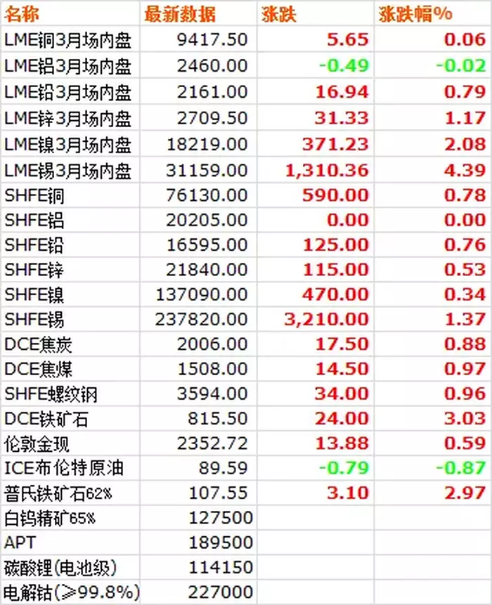 4月9日,LME六种基本金属价格涨多跌少,仅铝轻微下跌,锡领涨。三月期铜价宽幅波动,先抑后扬后小幅回落,收于9417.5美元/吨,上涨0.06%。三月期铝价宽幅震荡,收于2460美元/吨,下跌0.02%。三月期铅价收于2161美元/吨,上涨0.79%。三月期锌价探底回升,收于2709.5美元/吨,上涨1.71%。三月期锡价收于31159美元/吨,上涨4.39%。三月期镍价收于18219美元/吨,上涨2.08%。