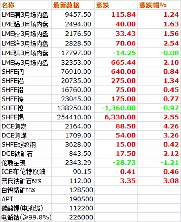 4月12日,LME六种基本金属价格涨多跌少,仅镍轻微下跌,锌领涨。三月期铜价先扬后抑,收于9457.5美元/吨,上涨1.24%。三月期铝价冲高后小幅回落,收于2494美元/吨,上涨1.63%。三月期铅价收于2176.5美元/吨,上涨1.56%。三月期锌价收于2828.5美元/吨,上涨2.54%。三月期锡价收于32353美元/吨,上涨2.10%。三月期镍价收于17797美元/吨,下跌0.08%。