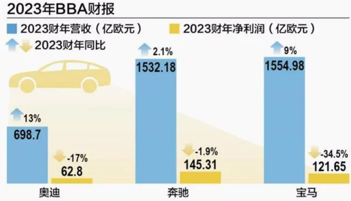 BBA三家的营收均为正增长,而有意思的是三家同时也都出现净利润负增长,这种同时“增收不增利”的情况此前并不多见。净利润方面,奔驰依然还是最会赚钱的一家,净利润为145.31亿欧元,同比微降1.9%;宝马净利润为121.65亿欧元,同比下滑34.5%;奥迪因营收相对偏低,净利润为BBA中最低的62.8亿欧元,同比下滑17%。其中奔驰净利润下滑的幅度最低,宝马净利润下滑的幅度最高,超过三分之一。