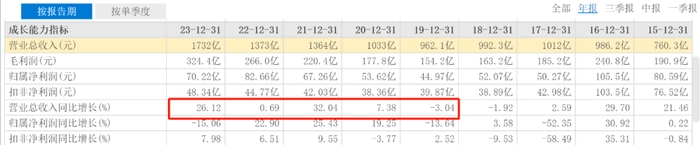 财报显示,2023年长城汽车的总营收为1732亿元,同比增长26.12%,该营收是长城汽车的历史新高,是2015年760.3亿元的2倍有余。在2022年营收增幅只有0.69%的情况下,2023年长城汽车的营收增长大幅提升。