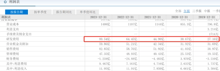 但长城汽车的归母净利润却由2022年的82.66亿元降至70.22亿元,下滑了15.06%。但从财报中可以发现,长城汽车的研发费用增长明显,由2022年的64.45亿元猛增至2023年的80.54亿元,涨幅为24.97%。近三年,长城汽车的研发力度明显提升,研发费用的增幅分别为46.36%、43.56%和24.97%,2020年长城汽车的研发费用为30.67亿元,2023年的研发费用是2020年的2.63倍。