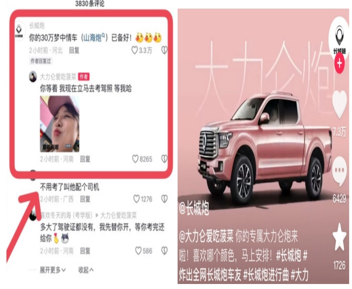 于是,有好事的网友开始喊话长城汽车,长城炮因此走红,应该给大力仑爱吃菠菜这位女生安排一辆。长城汽车官方倒也慷慨,喊话@大力仑爱吃菠菜,称“你的30万梦中情车(山海炮)已备好!”,瞬间点赞数万条。大力仑爱吃菠菜对这样的泼天富贵欣然接受,但因为她还没有驾照,发文回应称“你等着,我现在立马去考驾照”,就这样长城汽车和这位可爱的女生对长城炮的一唱一和,将长城炮再次推向新热度。