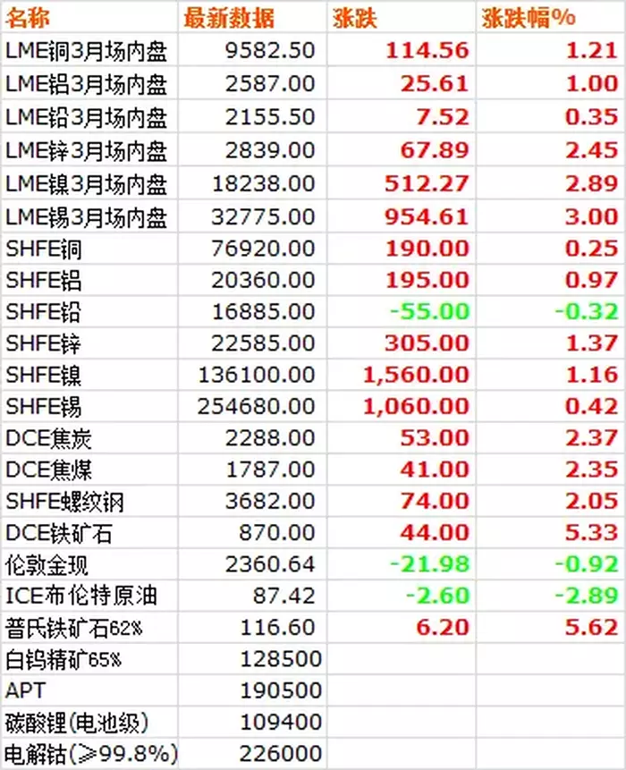 4月17日,LME六种基本金属价格全线上涨,锡领涨大盘。三月期铜价收于9582.5美元/吨,上涨1.21%。三月期铝价收于2587美元/吨,上涨1.00%。三月期铅价收于2155.5美元/吨,上涨0.35%。三月期锌价收于2839美元/吨,上涨2.45%。三月期锡价收于32775美元/吨,上涨3.00%。三月期镍价收于18238美元/吨,上涨2.89%。