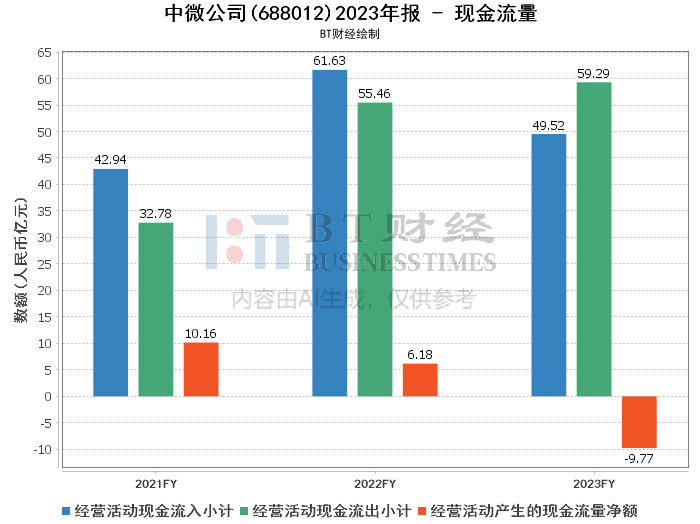 然而,在现金流量方面,中微公司2023年经营活动产生的现金流量净额为负,为-976.93百万元,同比下降了258.20%,这是一个值得警惕的信号。经营活动现金流入和流出的小计显示,现金流出增速超过了现金流入,导致现金流量净额出现大幅下滑。这可能与公司在扩张过程中面临的资金压力、原材料采购和员工薪酬等成本增加有关。