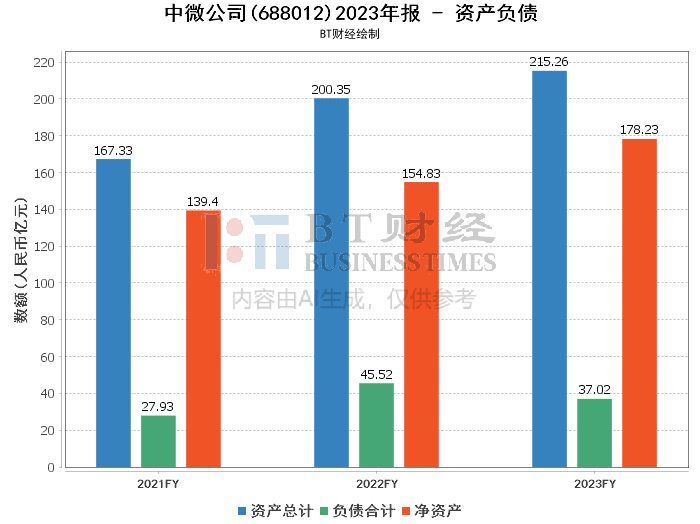 在资产负债方面,中微公司2023年末总资产达到215.26亿元,同比增长7.44%,表明公司规模在持续扩大。负债总额为37.02亿元,同比下降了18.72%,显示公司在控制负债方面取得了一定成效。净资产因未提供具体数据,无法直接分析,但根据总资产和负债的变化趋势,可以推测净资产也有所增长。