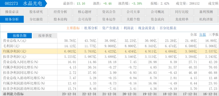 此外,水晶光电在2023年业绩表现不俗。全年营收50.76亿元,同比增长16.01%;归母净利润为6.002亿元,同比增长4.15%。这是在水晶光电上半年表现并不太理想的情况下取得的成绩,2023年前两个季度,水晶光电营收为8.769亿元和9.769亿元,同比增长-7.35%和4.15%。同期净利润为6263万元和4800万元,同比分别下滑18.68%和35.57%。