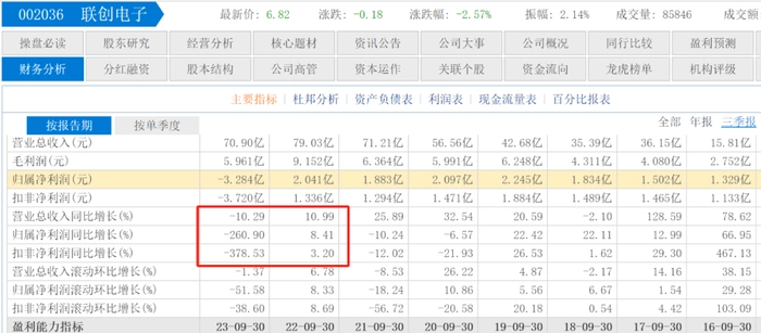 联创电子目前尚未发布2023年年报,在此前的业绩预告中表示,2023年度预亏5.8亿元-8.6亿元。2023年前三季度,联创电子营收70.90亿元,同比下滑10.29%;归母净利润-3.284亿元,同比下滑260.90%。而上一年同期的营收增长为10.99%、净利润增幅为8.41%。