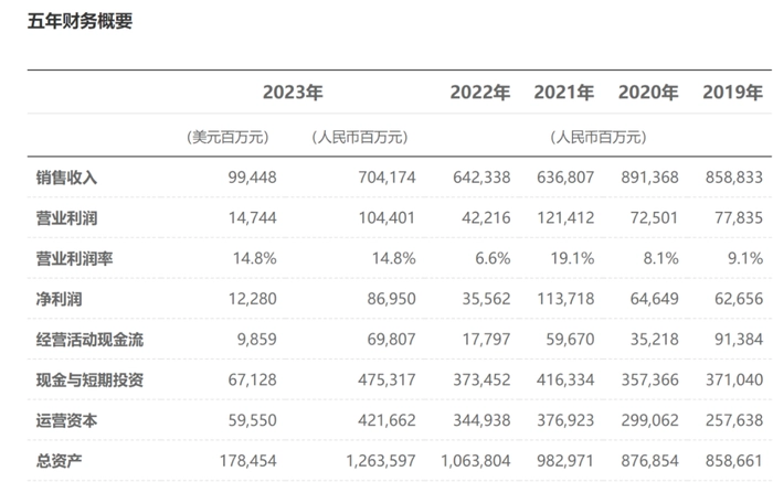 华为2023年的净利率为14.8%,仅次于2021年的19.1%,相比2022年6.6%的净利率提升了8.2个百分点。受限于制裁等因素影响,此前4年中,华为有3年的净利率低于10%,2019年和2020年的净利率为9.1%和8.1%。2023年的净利率大增,标志着华为的净利率回归正常水平。