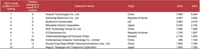 世界知识产权组织信息显示,华为2023年共申请6494件国际专利,位居全球第一,且已经连续7年霸榜。排名第二的是三星,专利数为3924件,比华为少了2570件。美国高通排名第三,专利数为3470件,约为华为的一半。日本三菱电机的专利数为2152件,不及华为的三分之一。在这份榜单中,专利数前十位的公司中,有4家来自中国。