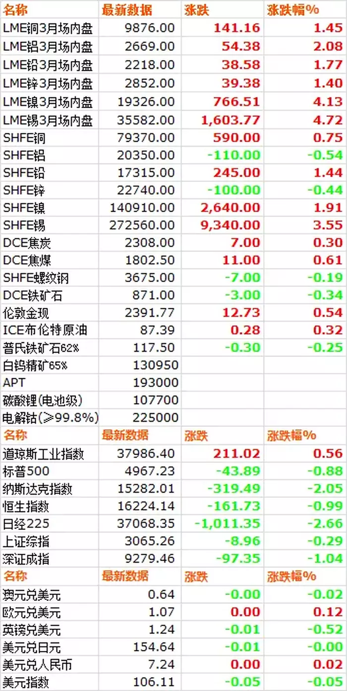4月19日,LME六种基本金属价格全线上涨,锡领涨大盘,镍涨幅居前。三月期铜价收于9876美元/吨,上涨1.45%。三月期铝价收于2669美元/吨,上涨2.08%。三月期铅价收于2218.5美元/吨,上涨1.77%。三月期锌价收于2852美元/吨,上涨1.40%。三月期锡价收于35582美元/吨,上涨4.72%。三月期镍价收于19326美元/吨,上涨4.13%。