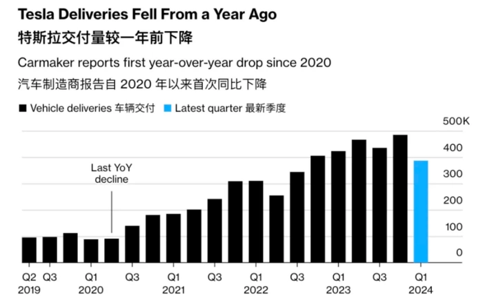 特斯拉的最大问题还是销量的大幅下滑,2024年第一季度,特斯拉的全球销量为38.68万辆,同比下滑8.53%,环比下跌20.2%。这是自2020年以来特斯拉首次单季度销量同比下降,这样的销量也是特斯拉过去5个季度最差表现。