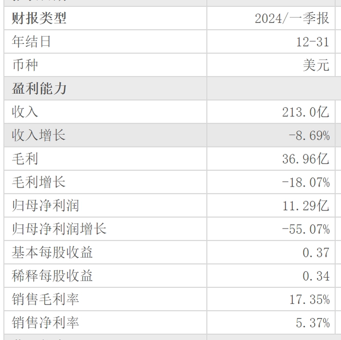但在最近发布的2024年一季报中,特斯拉的表现比较“辣眼睛”,一季度特斯拉营收213亿美元,同比下滑9%;净利润11.29亿美元,同比下滑55%。这也是特斯拉首次营收出现下滑。