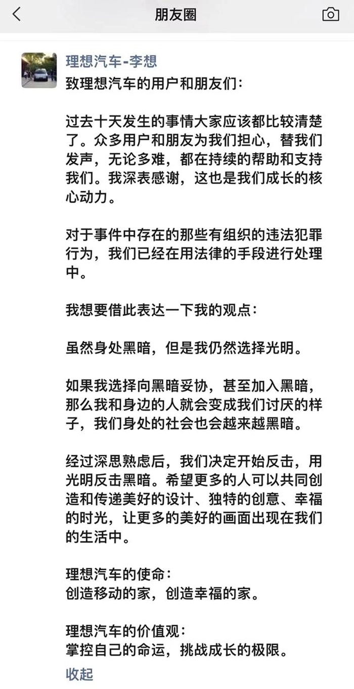 这种“网暴”,给理想MEGA的销量带来巨大影响,从理想官方一直没有公布理想MEGA的销量可以推断销量并不理想,这也是李想暴怒在朋友圈发文称“要用光明反击黑暗”的原因。他痛斥网络水军的行为,称其是一次有组织的违法犯罪行为,并表示不会向黑暗低头,要用法律的手段维护自身权益。小鹏汽车CEO何小鹏和华为终端BG CEO余承东都对李想表示了声援。