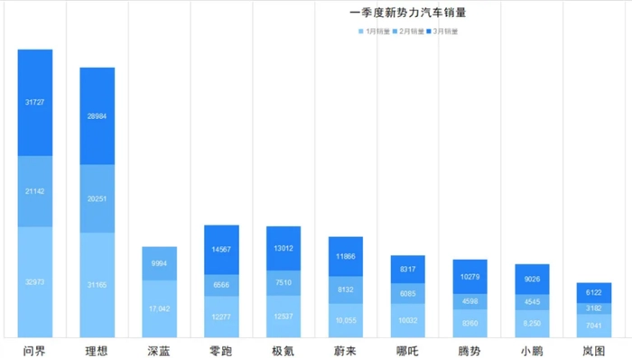 2024年第一季度,问界总销量达到85842辆,高于理想的8.04万辆,排名新势力汽车销量第一名,理想丢失的销冠宝座,正是拜问界所赐。以3月为例,3月问界销量为31727辆,排名新势力汽车销量第一,理想的销量为28984辆,落后问界2743辆。如果以单月比较,理想一季度三个月销量分别为31165辆、20251辆和28984辆,同期问界的销量为32973辆、21142辆和31727辆,每个月都力压理想一头、而理想在一季度的销量,虽然同比增长了52.9%,但是环比2024年1月和去年6-12月均出现不同幅度的下滑,颓势尽显。