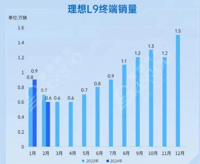 随着问界M9的问世,理想L9的销量受到一定影响,和此前理想L7、L8和L9每月销量均过万辆不同,3月理想只有理想L7的销量突破一万辆达10768辆,而作为理想最能打的车型理想L9的销量是8595辆和6392辆。2月理想L9终端销售6262辆,同比下降13.7%,环比下降28.97%。1月和2月累计销量15078辆,两月销量总和只和2023年12月持平。此前理想L9在2023年8月至12月连续5个月销量过万辆。