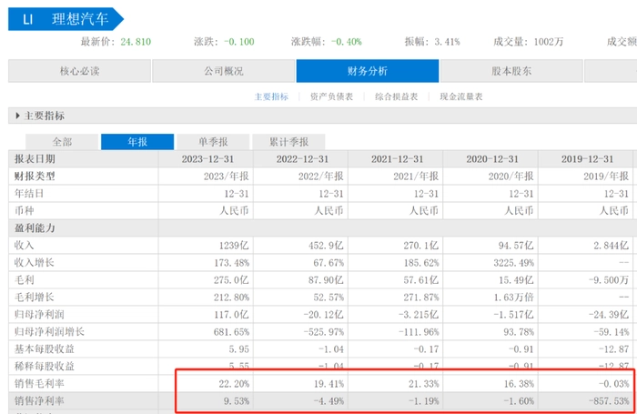 和特斯拉不断下滑的毛利率不同,理想的毛利率呈逐渐提升趋势。2019年至2023年,理想的毛利率分别为-0.03%、16.38%、21.33%、19.41%和22.20%,除2022年毛利率略有下滑之外,整体上呈提升趋势。2020年至2023年的4年时间毛利率提升了5.82个百分点。