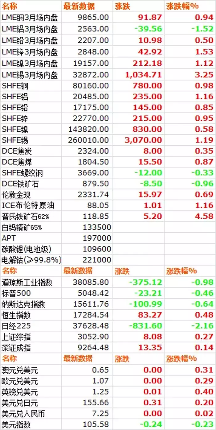 4月25日,LME六种基本金属价格涨多跌少,锡领涨,仅铝小幅下跌。三月期铜价收于9865美元/吨,上涨0.94%。三月期铝价收于2563.5美元/吨,下跌1.52%。三月期铅价收于2207.5美元/吨,上涨0.50%。三月期锌价收于2848美元/吨,上涨1.53%。三月期锡价收于32872美元/吨,上涨3.25%。三月期镍价收于19157美元/吨,上涨1.12%。