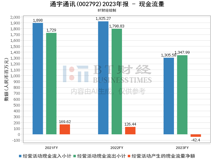 现金流量方面,通宇通讯2023年经营活动产生的现金流量净额为-42.4百万元,相比上年同期的1.26亿元大幅下降,反映出公司经营活动的现金流入能力有所减弱。