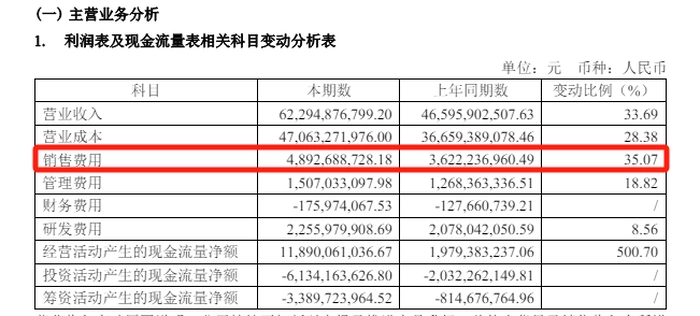 2023年报显示,当年销售费用从2022年的36.22亿元升高到2023年的48.93亿元,同比大幅升高35.07%。公司对此解释道,这是因为加大市场开拓和品牌宣传推广力度。投资者也很容易对比发现,公司的营收增速不如销售费用增速。