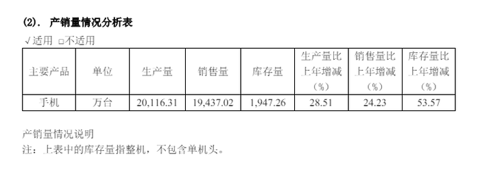2023年,传音控股生产量、销售量和库存量分别录得2.01亿台、1.94亿台和1947.26万台,前两者相较2022年同比增加28.51%和24.23%,但库存量同比大增53.57%。