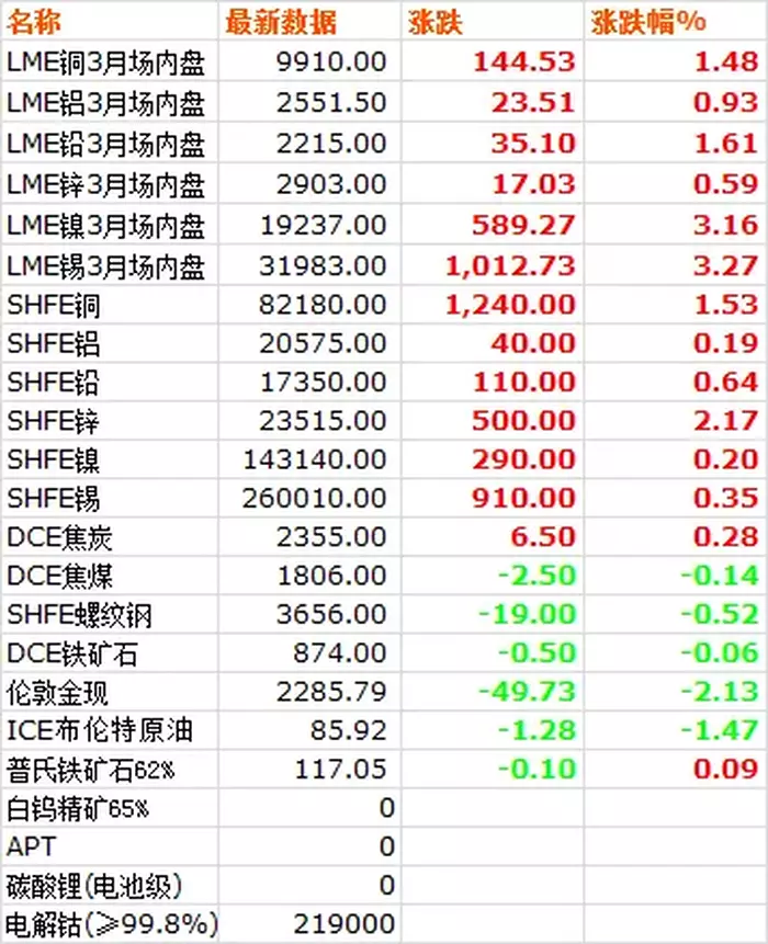 5月3日,LME六种基本金属价格全线上涨,锡镍领涨,假期期间整体先抑后扬。三月期铜价收于9910美元/吨,上涨1.48%。三月期铝价收于2551.5美元/吨,上涨0.93%。三月期铅价收于2215美元/吨,上涨1.61%。三月期锌价收于2903美元/吨,上涨0.59%。三月期锡价收于31983美元/吨,上涨3.27%。三月期镍价收于19237美元/吨,上涨3.16%。