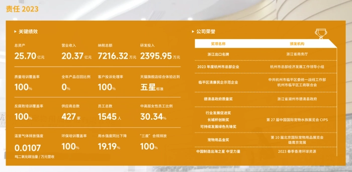相同之处在于,天元宠物虽然瞄准“它经济”赛道,但本质仍是一家轻工制造公司。正如其ESG报告披露的关键责任绩效,包含了研发投入、客诉率、天猫旗舰店综合体验度、供应商总数等常规制造业公司关注的指标。