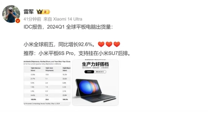 5月5日,雷军在社交平台发文,称小米平板出货量在2024年第一季度跻身全球前五,同比增长达到了92.6%。与此同时,小米手机销量位列全国第5(世界第3),小米智能门锁销量全国第1,小米无线耳机销量全国第2,小米智能手表销量全国第4,小米电视机销量全国第2,小米冰箱销量全国第5,小米空调销量全国第4,小米路由器销量全国第3……从空调等家电排行来看,小米产品矩阵已经深入格力腹地。有机构预测,以小米汽车业务现在的势头(4月卖了7000多台),可能很快就能进入全国前三。