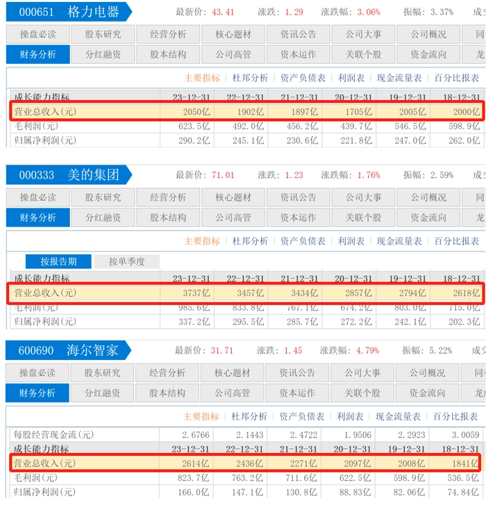 另外一家家电三巨头之一的海尔智家在2018年的营收为1841亿元,落后格力159亿元,但在2019年完成了对格力营收的超越,2019年格力营收2005亿元,同比只增长了0.24%,而海尔智家在2019年营收为2008亿元,同比增长9.05%。随后2020年至2023年海尔智家的营收均超越格力,2023年海尔智家营收2614亿元,由2018年落后159亿元,到反超格力564亿元,海尔智家用时5年。