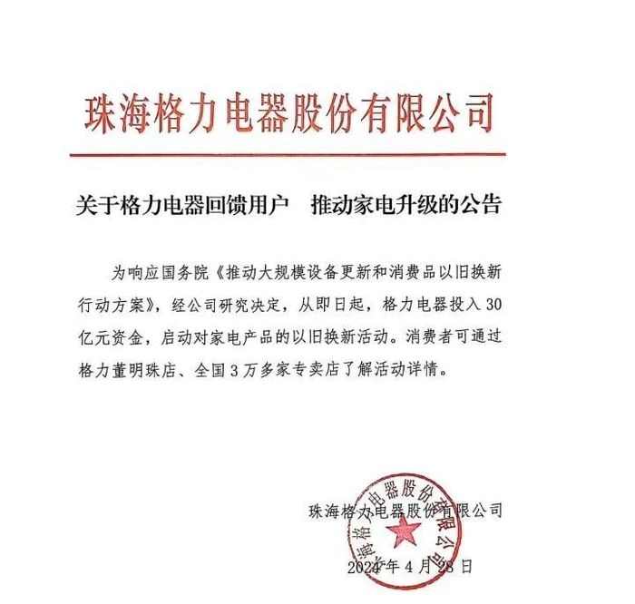 4月28日,格力电器在微信平台披露公告称,为响应国务院《推动大规模设备更新和消费品以旧换新行动方案》,经公司研究决定,从即日起,格力电器投入30亿元资金,启动对家电产品的以旧换新活动。