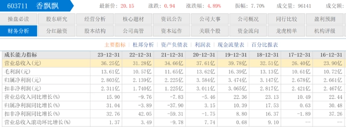 2023年,香飘飘的业绩相比此前3年有了较大提升,总营收36.25亿元,同比增长15.9%;归母净利润2.803亿元,同比增长31.04%。这样的业绩表现对香飘飘持续萎靡的股价注入一针强心剂,财报发布后的第一个交易日,香飘飘股价报收17.66元/股,涨幅4.5%。