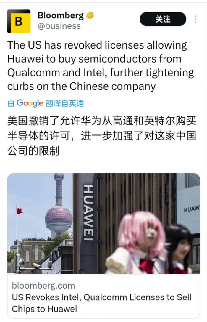 5月7日,彭博社、英国《金融时报》和路透社等多家外媒援引消息称,拜登政府当天进一步收紧了对华为的出口限制,撤销了美国芯片企业高通和英特尔公司向华为出售半导体的许可证。