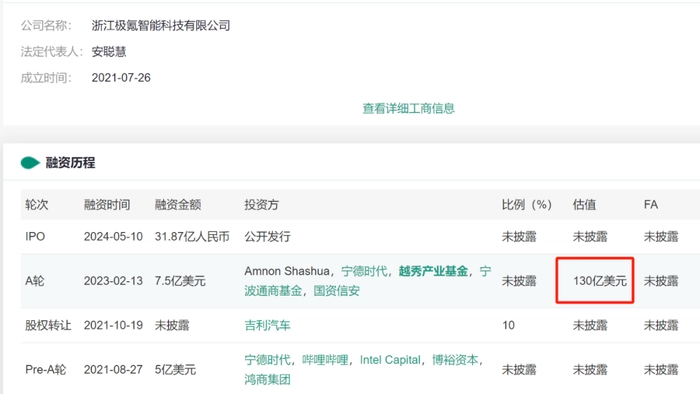 成立仅仅1年,李书福就将极氪的IPO提上了日程。2022年12月吉利集团在港交所发布公告,公告称建议分拆极氪汽车使其独立上市,并向美国证交会递交了可能进行首次公开发售的注册声明草案。为此极氪还进行了A轮融资。烯牛数据显示2023年2月13日,极氪完成A轮融资,投资方包括阿姆农·沙书亚(Amnon Shashua 英特尔高级副总裁)、宁德时代、越秀产业基金、宁波通商基金、国资信安、鸿商集团、B站、博裕投资等。本轮融资规模达7.5亿美元,估值已经达到130亿美元。这一估值后被吉利汽车集团高级副总裁CFO戴庆曾在吉利汽车2023年中期业绩会证实。