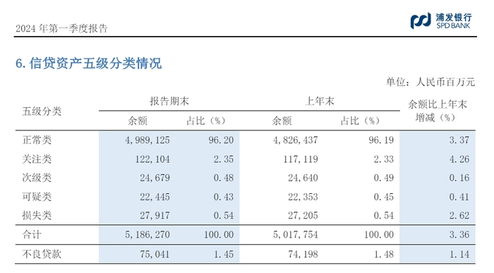 从信贷资产五级分类情况来看,浦发银行也不存在显著放松不良认定标准的迹象。2024年一季度,浦发银行“关注类”贷款余额占比2.35%,环比来看和2023年末的2.33%相差不多、略有提升,同比来看和2023年一季度的2.15%有0.2个百分点的提升。