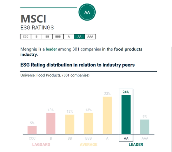蒙牛的ESG评级获得了较高认可。比较有代表性的是它在2023年MSCI的ESG评级中,从A级跃升至AA级,反映出这家综合型乳制品龙头企业的ESG管治工作获得国际水平的认可。