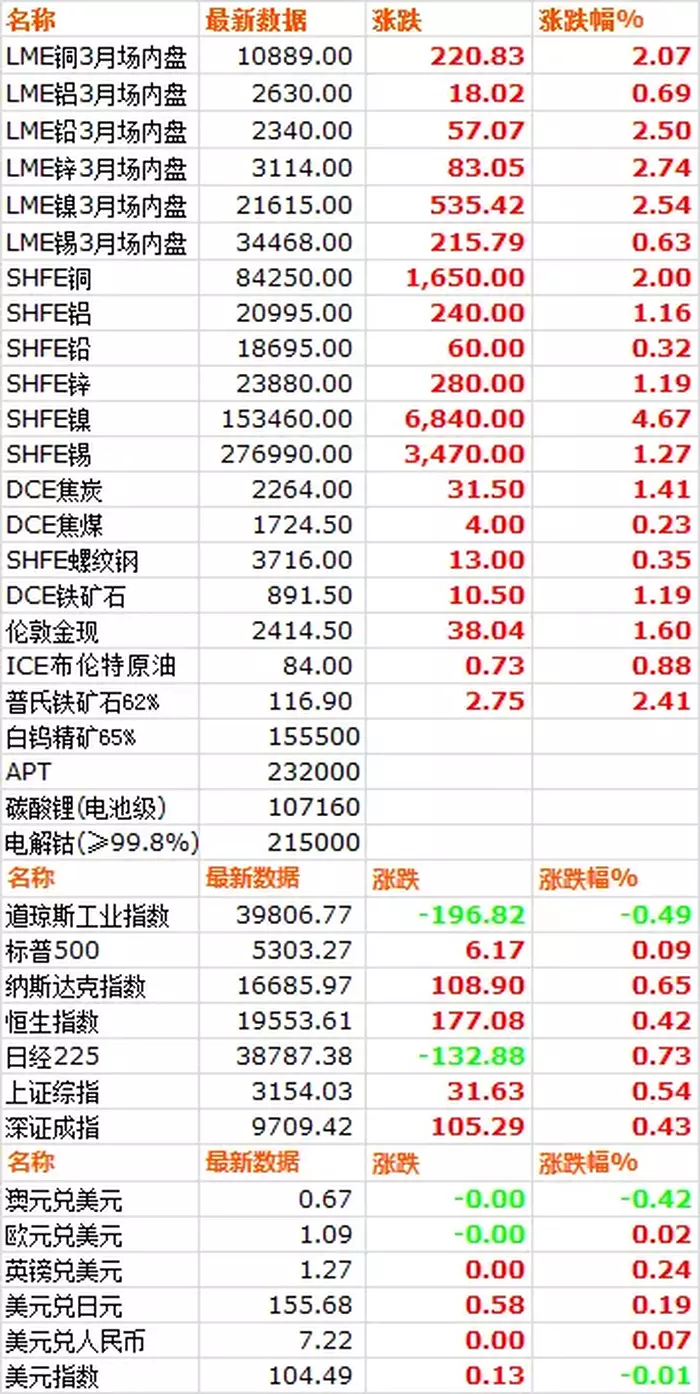 5月20日,LME六种基本金属价格全线上涨,锌领涨大盘。三月期铜价收于10889美元/吨,上涨2.07%。三月期铝价收于2630美元/吨,上涨0.69%。三月期铅价收于2340.5美元/吨,上涨2.50%。三月期锌价收于3114美元/吨,上涨2.74%。三月期锡价收于34468美元/吨,上涨0.63%。三月期镍价收于21615美元/吨,上涨2.54%。