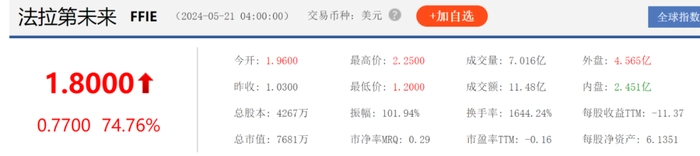 5月7日,FF的股价为0.044美元/股,截至5月20日收盘,FF股价为1.80美元/股,市值升至7681万美元,在此期间,FF股价暴涨3991%,同样创下美股同期涨幅最高记录。一家原本濒临被退市和破产的车企,竟然神奇地复活了。