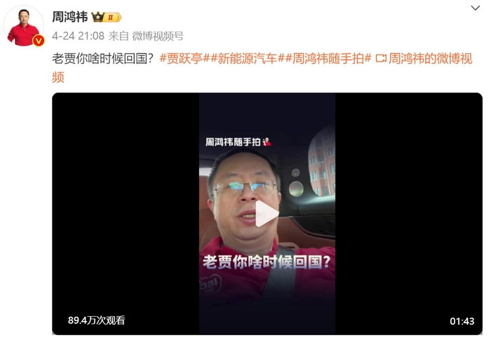 两人近期的首次互动是在4月22日,这一天是哪吒汽车春季发布会召开之日,在发布会上,周鸿祎讽刺贾跃亭去美国造车是失误,“完全没有搞明白中国优势,跑到美国去供应链又贵、又稀缺。”周鸿祎调侃贾跃亭称,贾跃亭跑到美国那么长时间也没造出几辆车,高合汽车反而造出来了,他却反过来告人家。