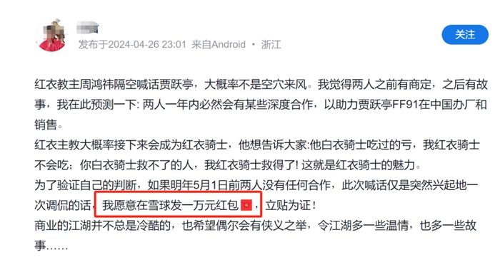 对于两人的频繁互动,知乎上有网友认为两人之前有商定,之后还会有故事。周鸿祎或会助力贾跃亭在中国办厂和销售。并承诺如果明年5.1之前两人没有合作,他将发一万元红包。该贴点赞数量众多,说明很多网友认可该网友的观点。