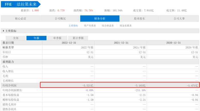 因为离谱的交付数据和糟糕的财务数据,FF并未发布2023年年报。在2020年至2022年,FF分别亏损1.471亿美元、5.165亿美元和5.521亿美元,这三年累计亏损达12.16亿美元。