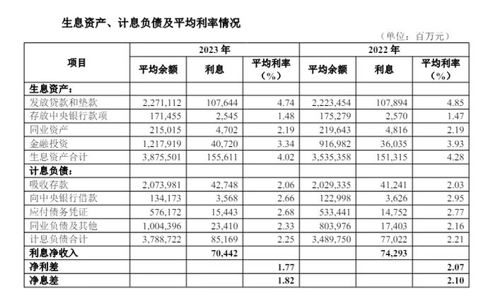 细看发放贷款和垫款,对公贷款(包括贴现)平均余额1.57万亿元,是同期个人贷款平均余额0.70万亿元的两倍还多,显示出对公是华夏银行的主力业务。但对公业务的平均利率为4.19%,大幅低于个人贷款的5.98%。同比变化幅度显示,2023年,华夏银行的对公贷款利率下滑幅度是0.24个百分点,而个人贷款的平均利率从5.85%攀升至5.98%。