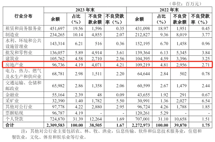 与此同时,不良贷款也主要集中在制造业、批发和零售业和房地产业。尤其值得注意的是对房地产业,虽然贷款余额从2022年末的超1000亿元压降到2023年末的967.36亿元,但是不良贷款从29.56亿元升高到了40.71亿元,不良贷款率从2.71%大幅提升到4.21%。