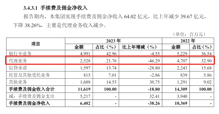 华夏银行分析指出,2023年手续费及佣金净收入的大幅下降,主要是代理业务收入减少拖累。当年代理业务的同比降幅高达46.29%。这一项业务指的是银行接受客户的委托,代替客户进行一系列金融服务活动,例如支付代理、收款代理、证券代理、保险代理等。