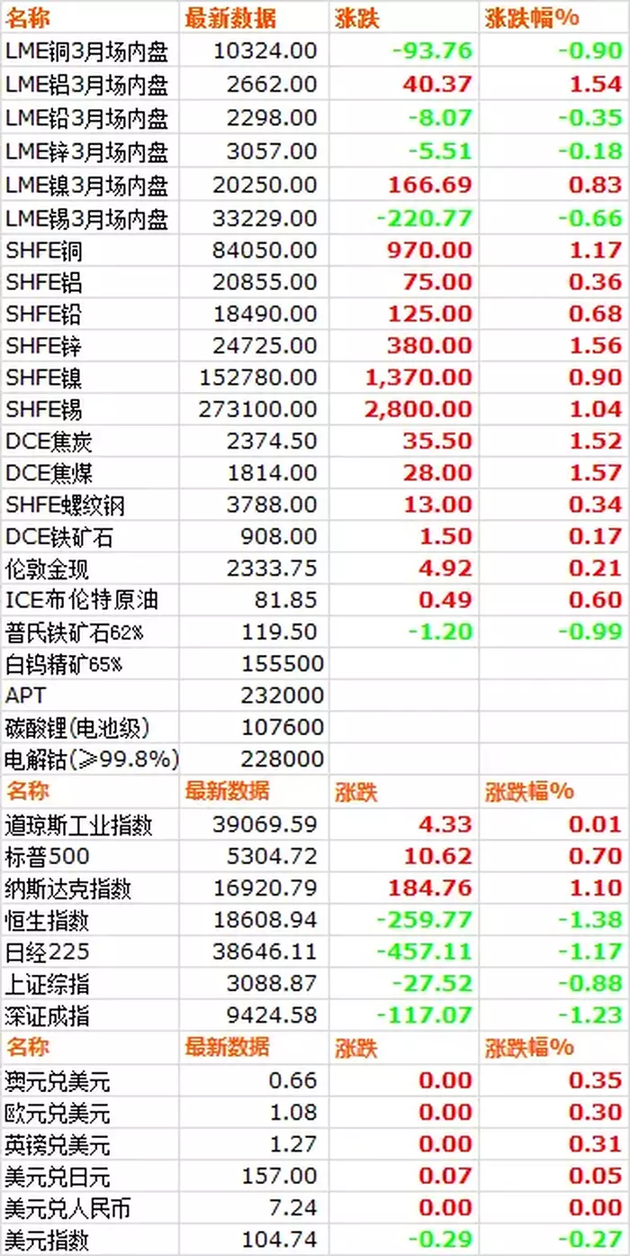 5月24日,LME六种基本金属价格跌多涨少,铝镍上涨,铜跌幅居前。三月期铜价收于10324美元/吨,下跌0.90%。三月期铝价收于2662美元/吨,上涨1.54%。三月期铅价收于2298美元/吨,下跌0.35%。三月期锌价收于3057美元/吨,下跌0.18%。三月期锡价收于33229美元/吨,下跌0.66%。三月期镍价收于20250美元/吨,上涨0.83%。