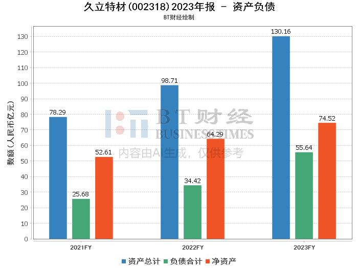 在资产负债方面,久立特材的总资产从2022年的98.71亿元增长至2023年的130.16亿元,增长了31.87%,显示出公司资产规模的显著扩大。负债合计也从34.42亿元增加至55.64亿元,资产负债率从34.87%上升至42.75%,反映出公司为支持业务扩张,相应增加了负债规模,但整体财务结构仍保持健康。