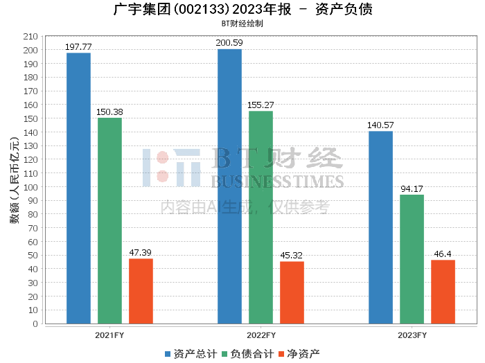 在资产负债方面,广宇集团的总资产从2022年的200.59亿元减少至2023年的140.57亿元,减少了29.92%。负债合计从2022年的155.27亿元减少至2023年的94.17亿元,资产负债率从77.41%降至66.99%,显示出公司在优化资产结构,降低负债水平方面取得了显著成效。尽管净资产略有下降,但通过有效的负债管理,公司的财务结构更为健康稳定。